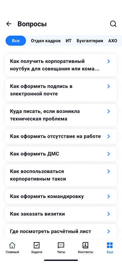 База вопрос-ответ по самым популярным темам для всех отделов компании.